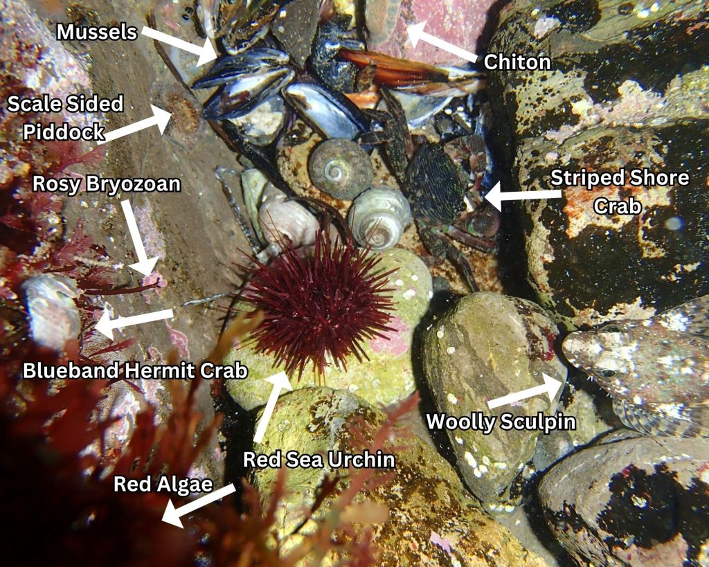 The camouflaged woolly sculpin. The striped shore crab resting on mussel shells. The hermit crab feeding. A chiton clinging to the rock. The siphon of a scale sided piddock. Red algae in the foreground. Rosy bryozoan encrusting the substrate.